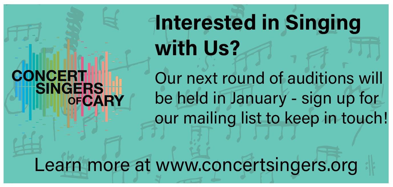 Concert Singers of Cary is supported by United Arts Council of Raleigh and Wake County as well as the N.C. Arts Council, a division of the Department of Natural and Cultural Resources